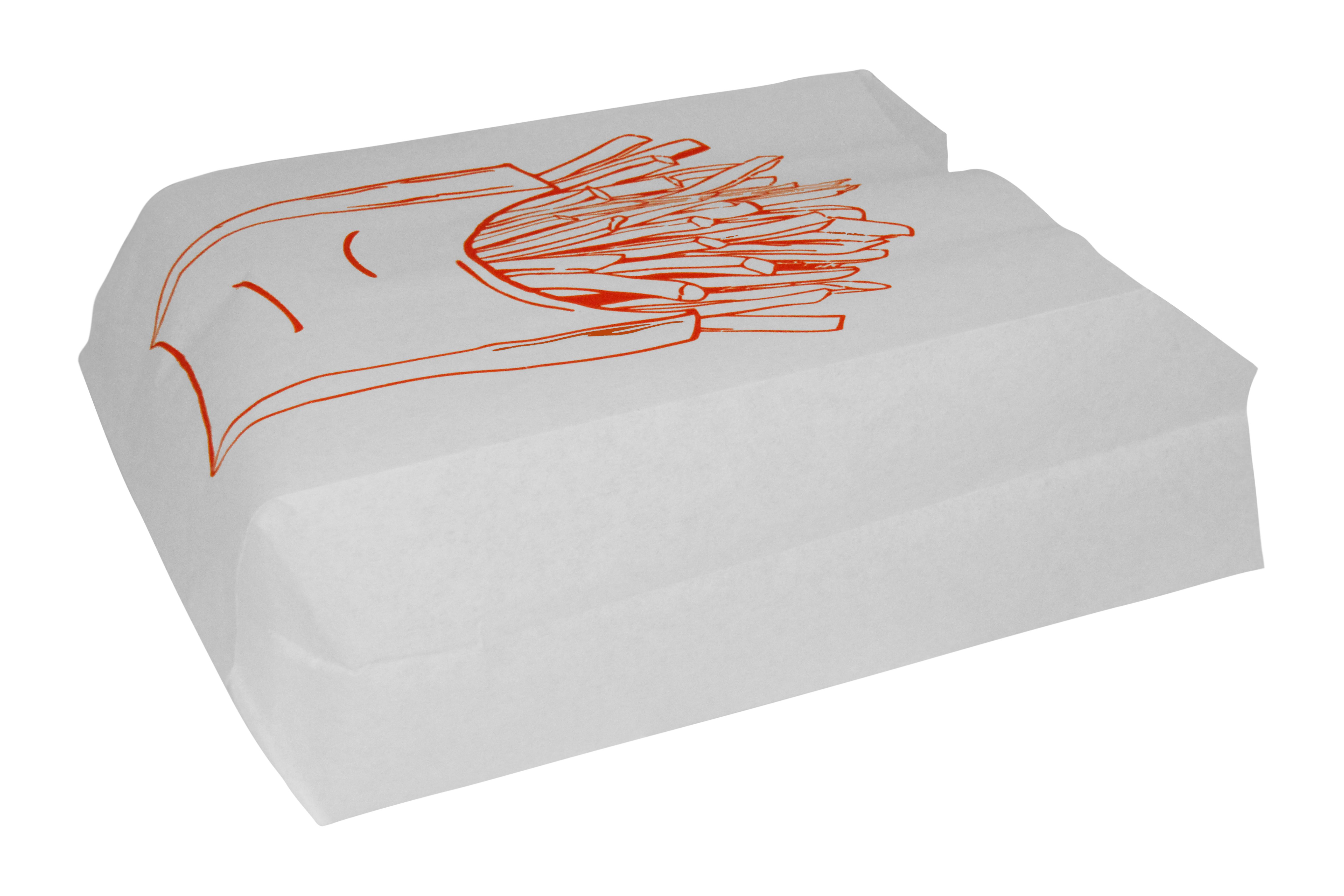 Размер 80×30×175 мм. Бумага белая жиростойкая плотность 52 г/м² с рисунком. V-образное дно. Боковые складки.