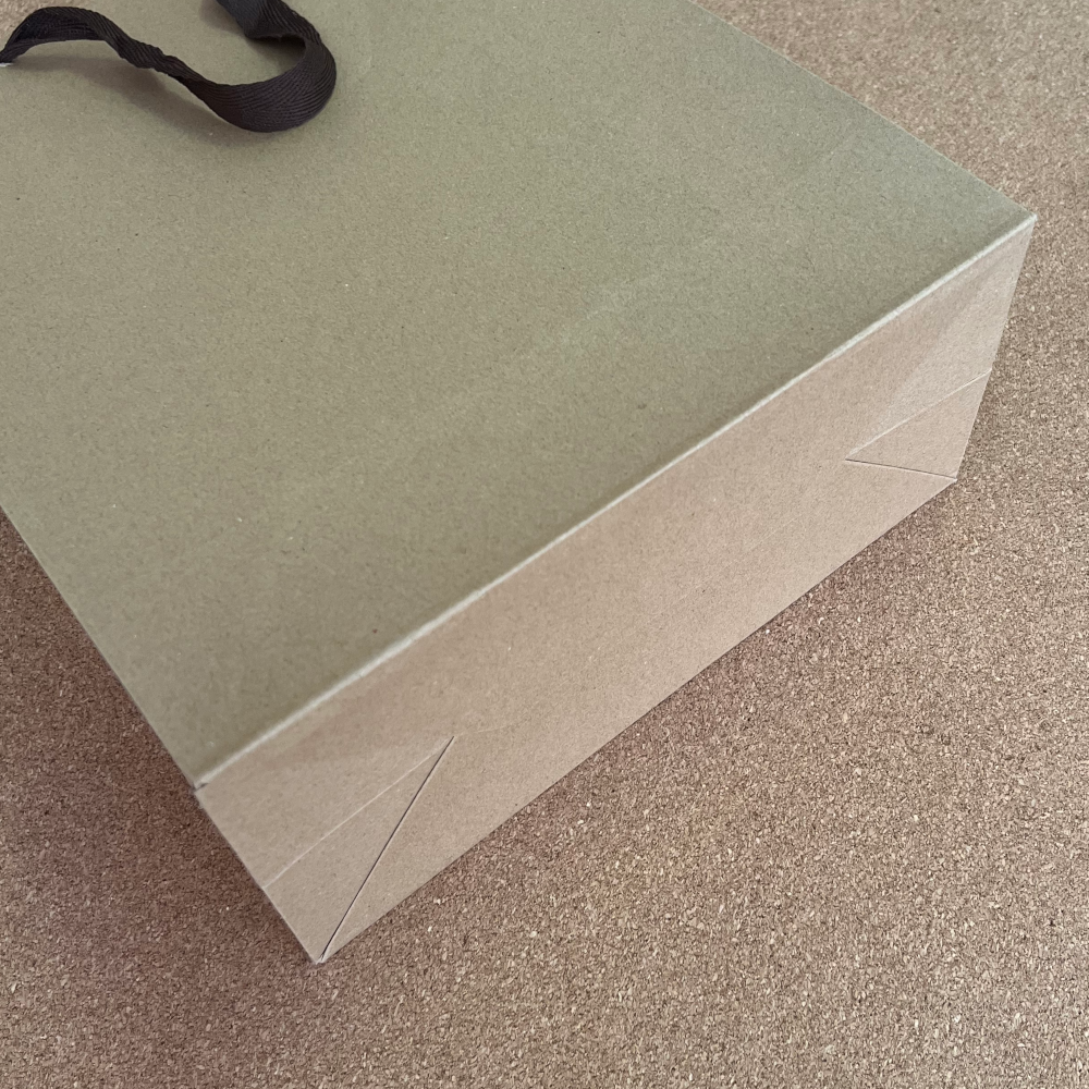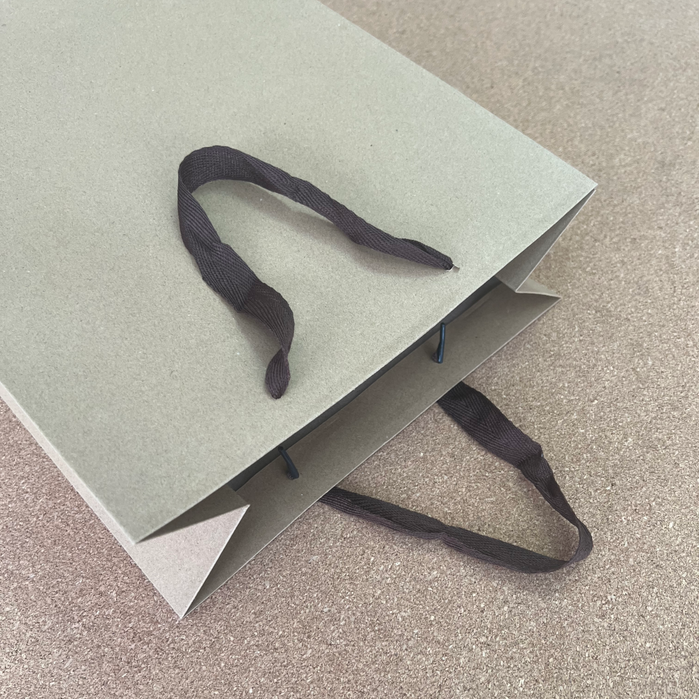 Размер 26×12×32 см. Крафт-бумага плотностью 150 г/м², с ручками из тканевой ленты, цвет ручек темно коричневый.
