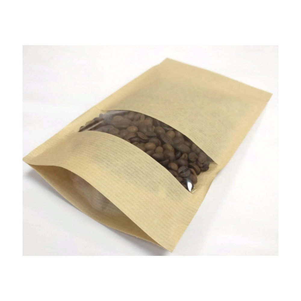 Размер дой-пака 120×185+(35+35) мм. Высота до замка 160 мм. Прямоугольное окно высотой 40 мм. Материал гладкая крафт-бумага, ламинированная полипропиленом. Замок зиплок.
