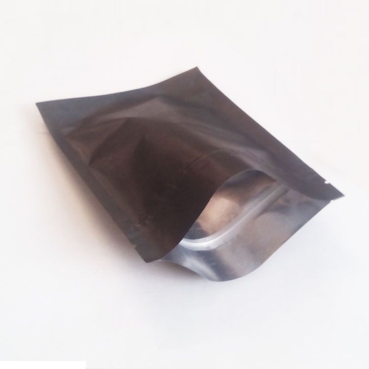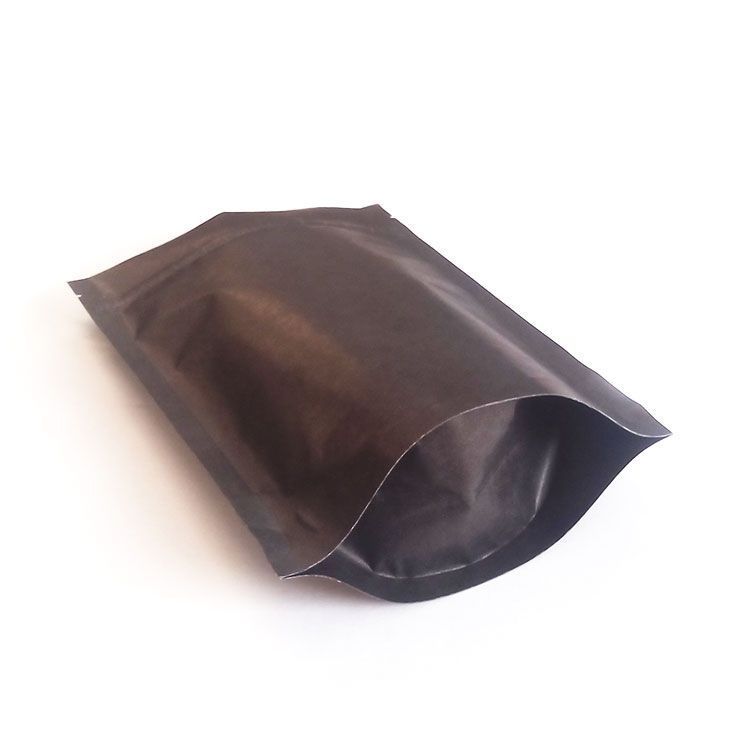 Размер 120×185+(35+35) мм. Высота до замка 140 мм. Материал крафт-бумага чёрного цвета, ламинированная металлизированным полипропиленом (бумага/BOPPmet/PE). Замок зиплок. Насечки.