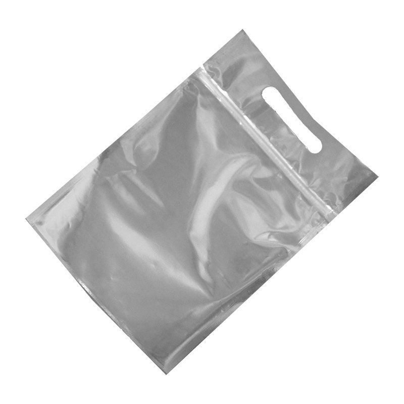 Размер внешний 220×320 мм. Размер внутренний 200×260 мм. Пленка фольгированная (ПЭТ/Al/ПЭ) плотность 115 мкм. Трёхшовные. Одна сторона прозрачная. Вторая сторона фольгированная, снаружи белая. Вырубная ручка "банан".