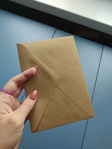 Размер С6 114×162 мм. Изготовлен из коричневой крафт-бумаги плотностью 80 г/м². Клапан треугольный с водорастворимым клей.