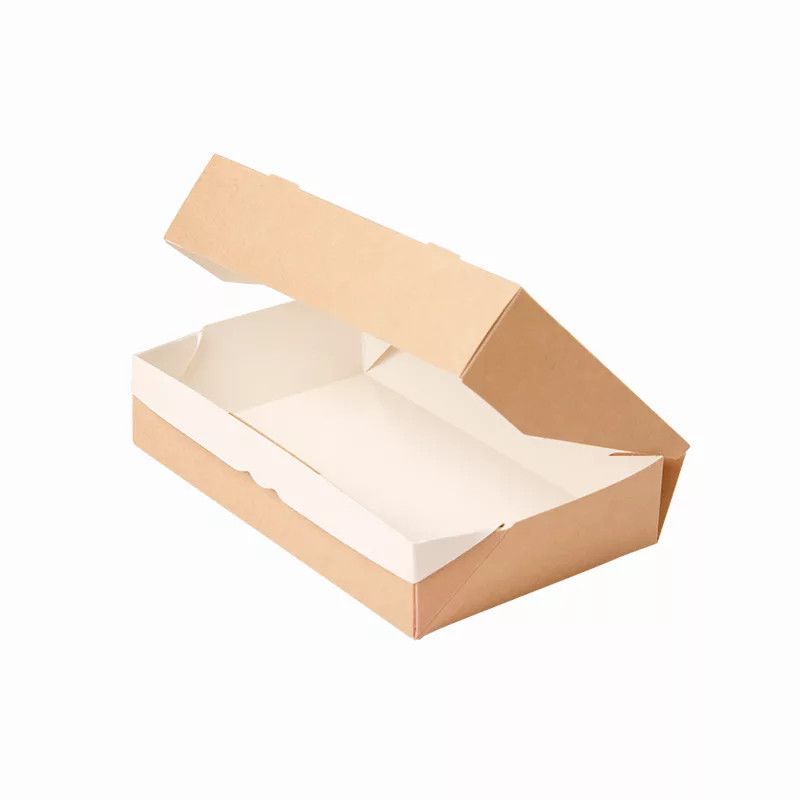 Размер 200×120×40 мм (объем 1000 мл). Изготовлена из картона с прозрачным окном. Удерживает воду. Полностью ламинирован изнутри. Пригоден для разогрева в микроволновой печи. Полностью биоразлагаемый.