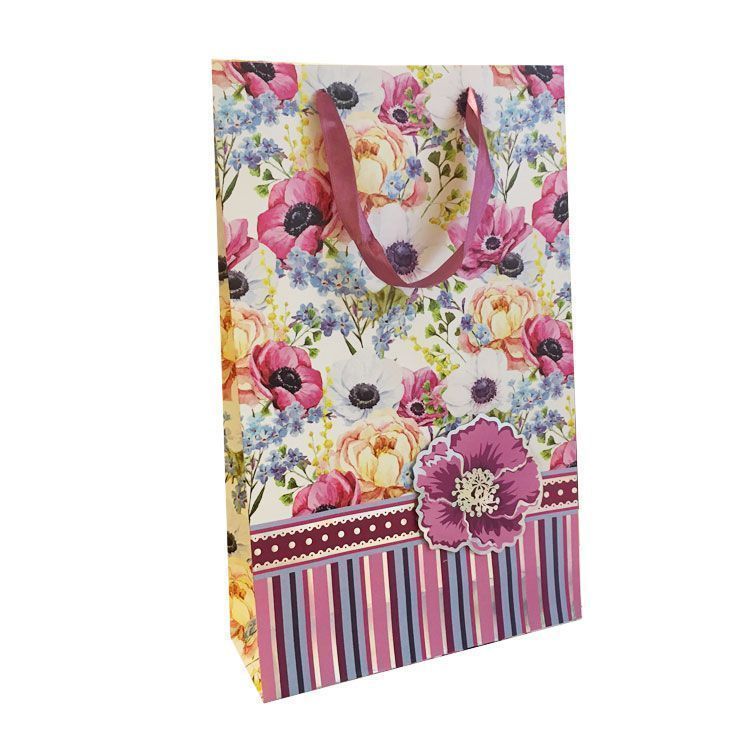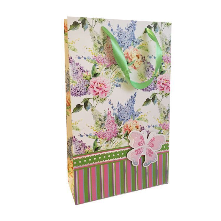 Размер 248×405×90 мм. Материал плотная бумага. Рисунок с аппликацией 4 дизайна в упаковке. Плоское дно. Верёвочные ручки.