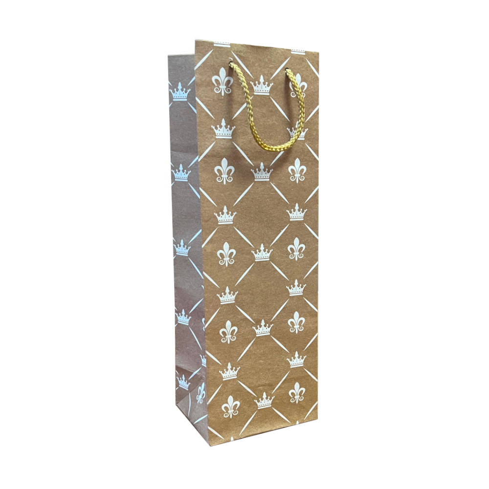 Размер 123×362×100 мм. Плотная крафт-бумага бурого цвета. В упаковке 2 дизайна. Плоское дно. Верёвочные ручки.