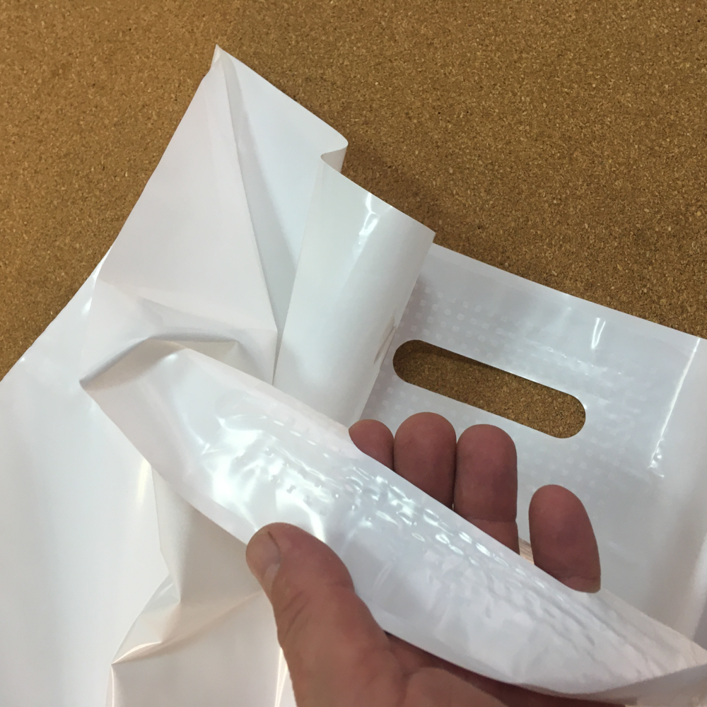 Размер 700×500(+30) мм. Плотность 70 мкм. Цвет пленки белый. Усиленная вырубная ручка. Закладное дно.