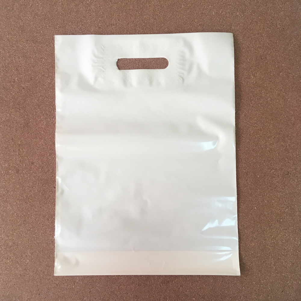 Размер 300×400(+30) мм. Плотность 70 мкм. Цвет пленки бежевый. Pantone 156C. Усиленная вырубная ручка. Закладное дно.
