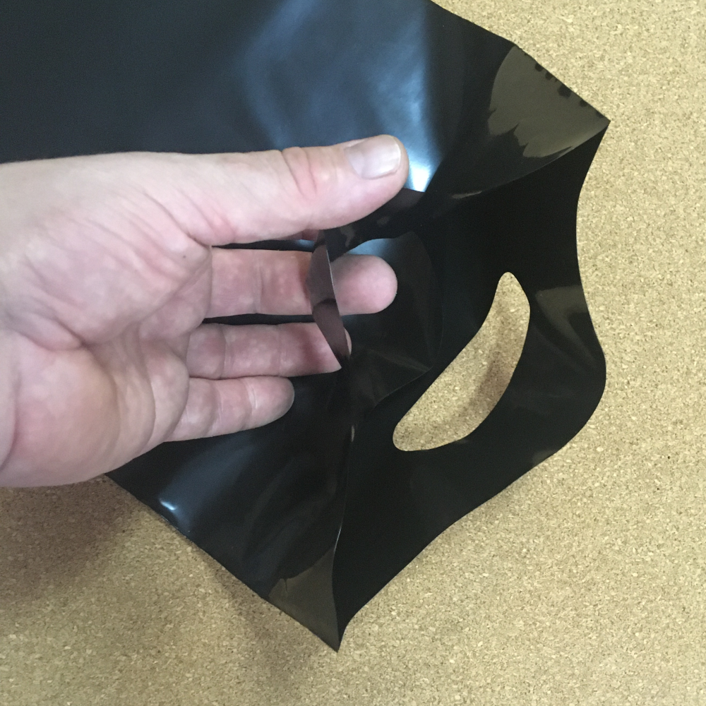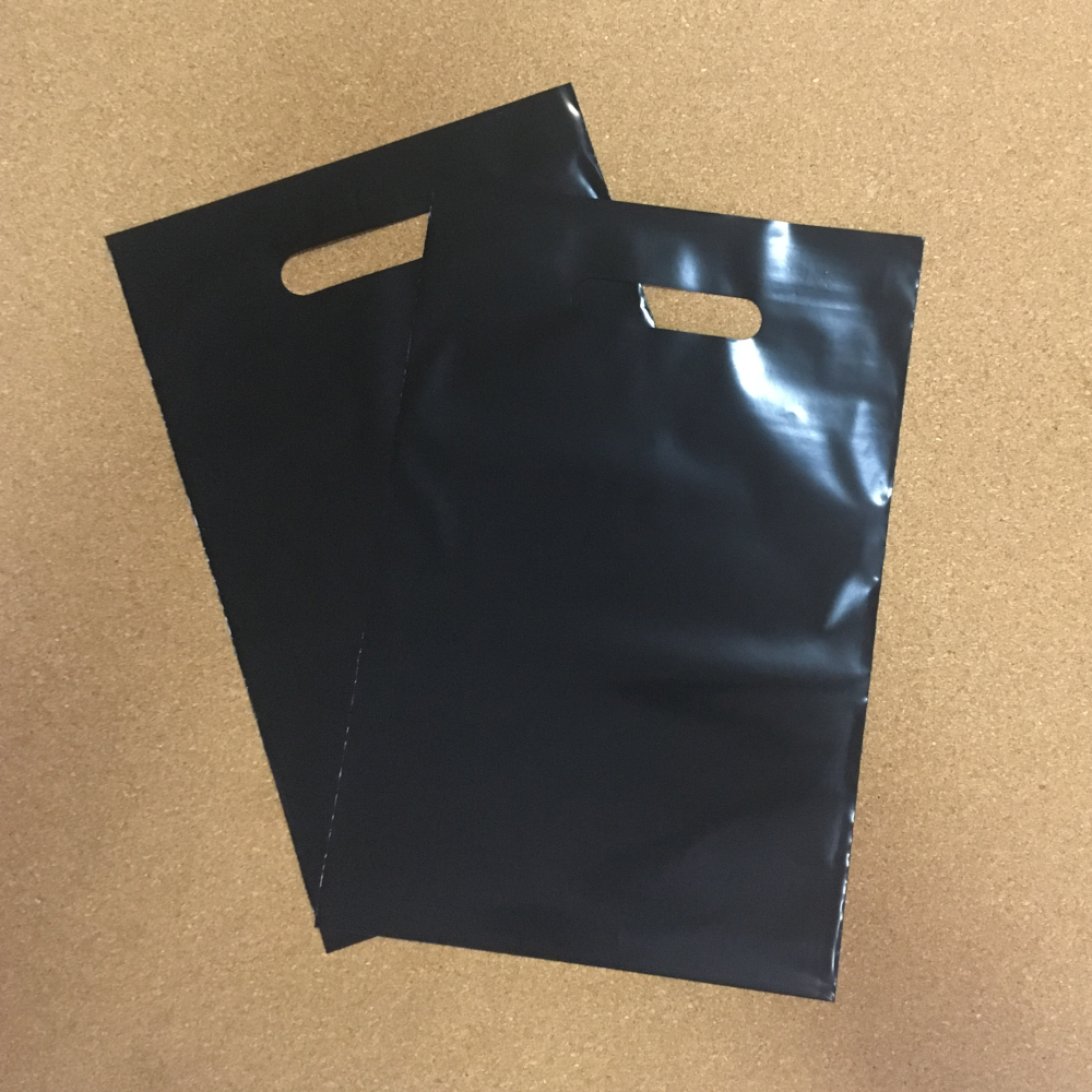 Размер 225×340 мм. Плотность 70 мкм. Цвет пленки черный. Вырубная ручка без усиления. Без закладного дна.