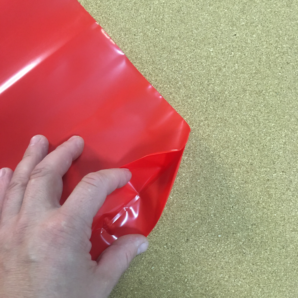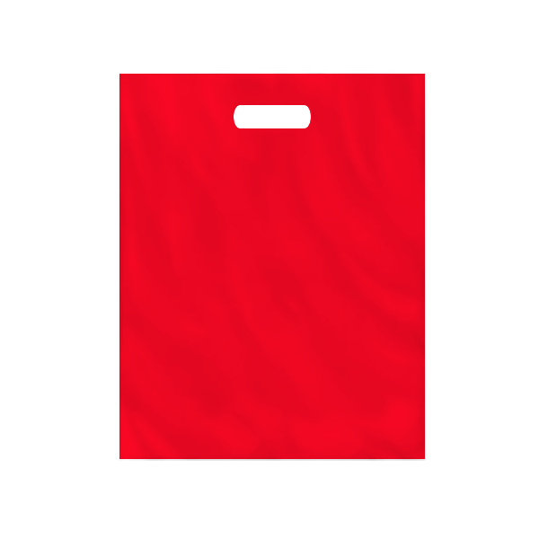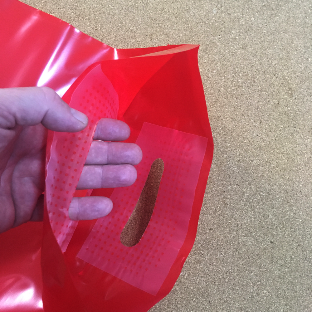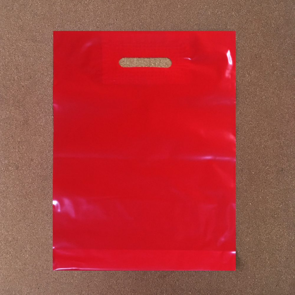 Размер 300×400(+30) мм. Плотность 70 мкм. Цвет пленки красный, близок к Pantone 1805C. Усиленная вырубная ручка. Закладное дно.