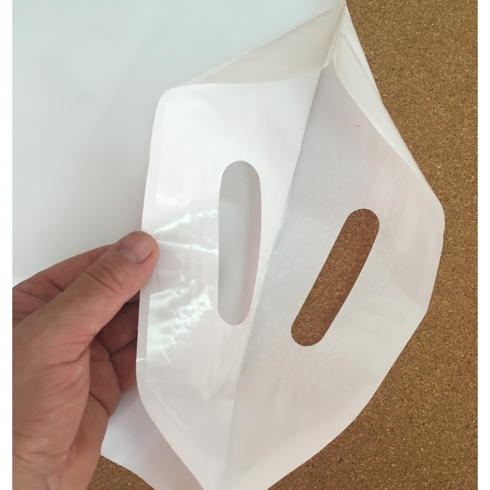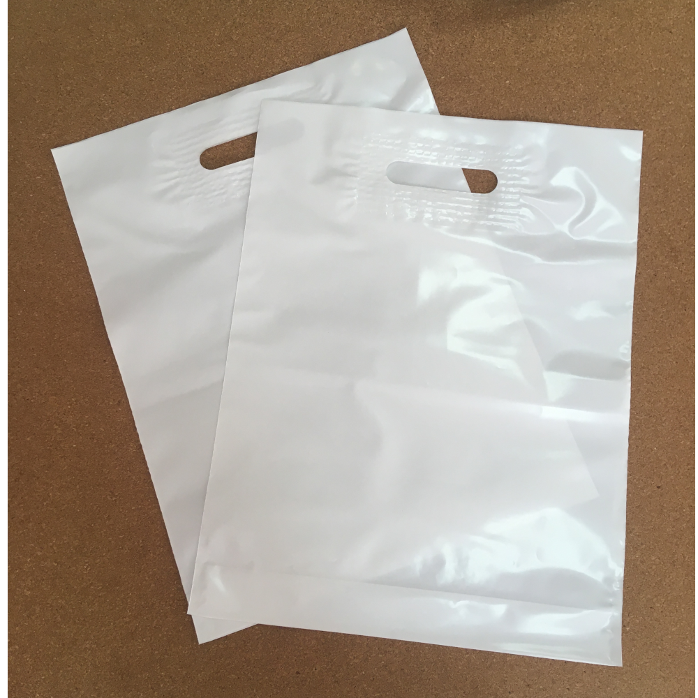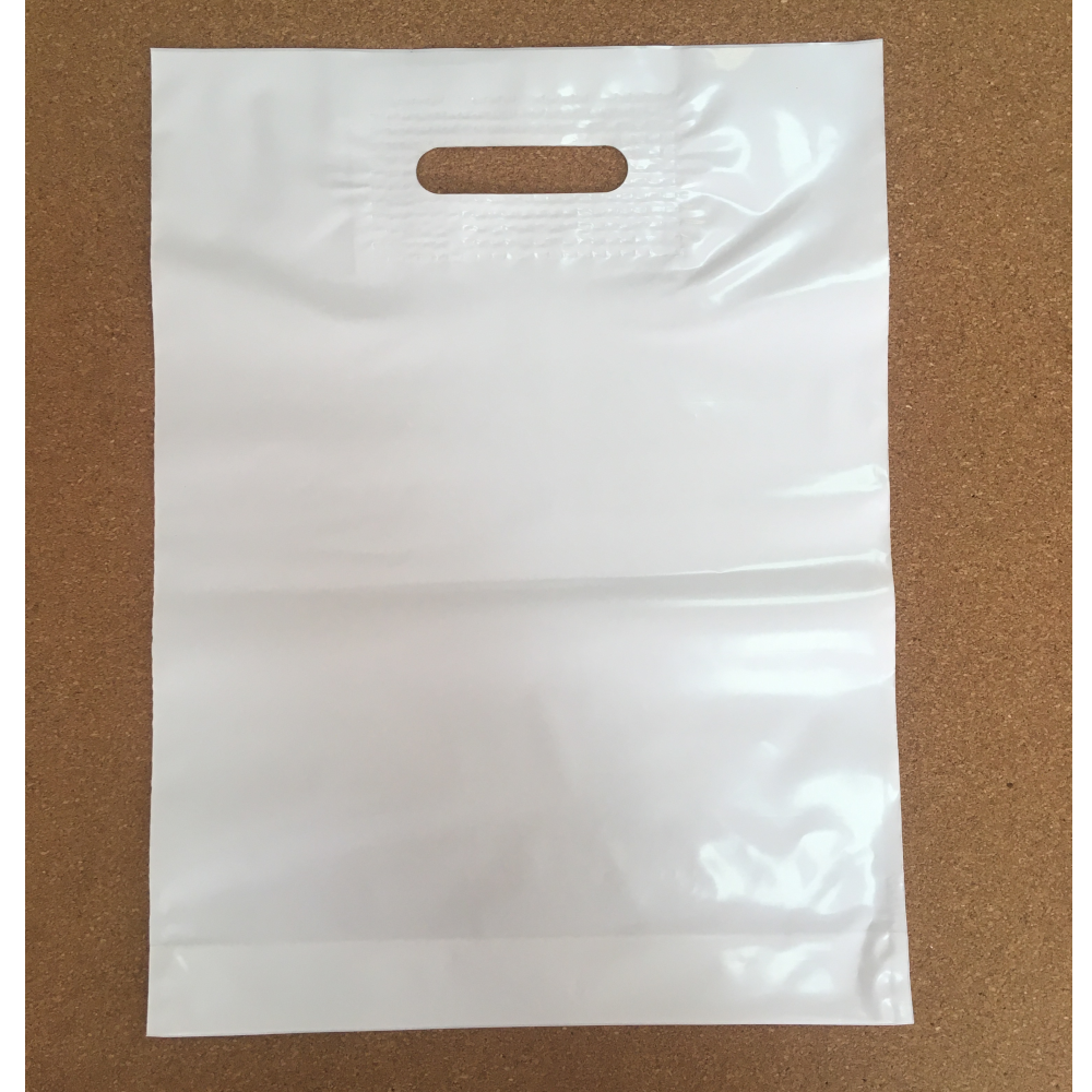 Размер 300×400(+30) мм. Плотность 70 мкм. Цвет пленки белый. Усиленная вырубная ручка. Закладное дно.