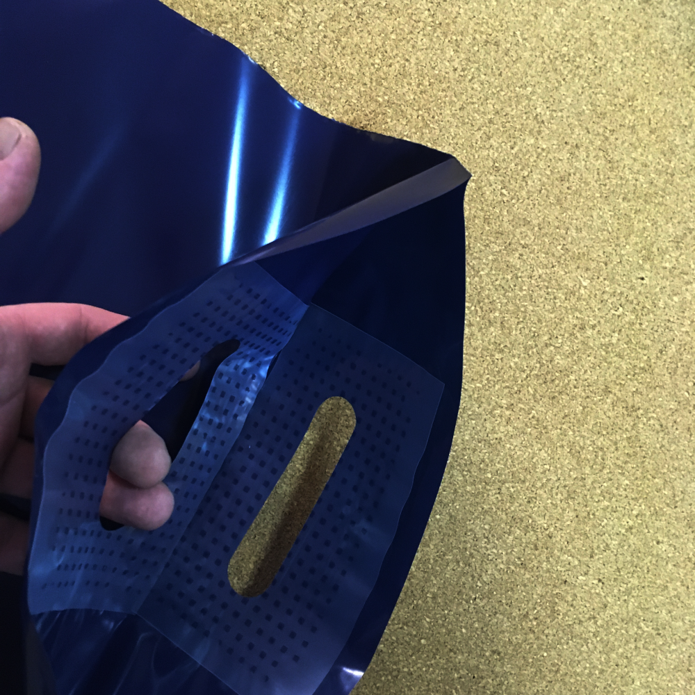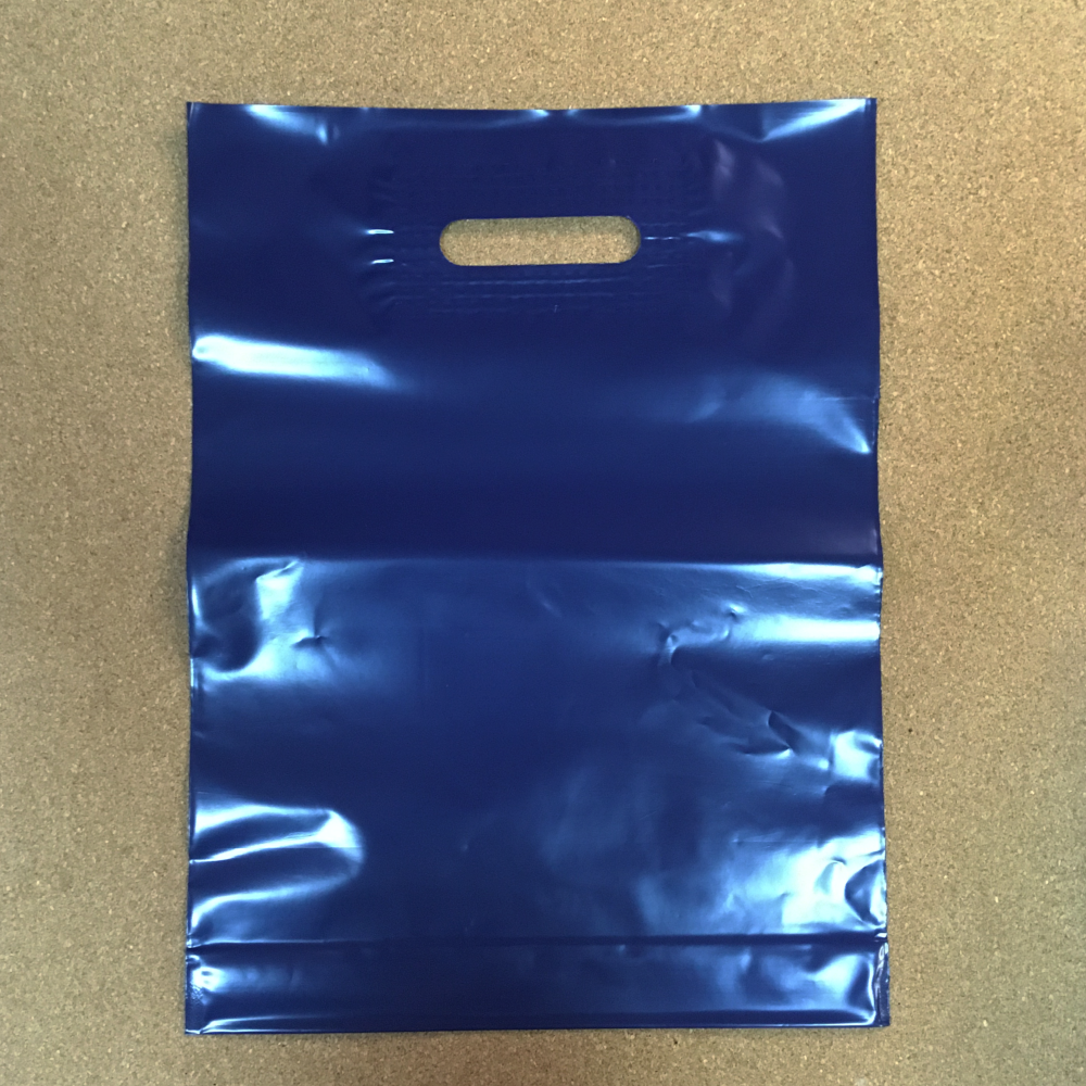 Размер 300×400(+30) мм. Плотность 70 мкм. Цвет пленки синий. Pantone 2767C. Усиленная вырубная ручка. Закладное дно.
