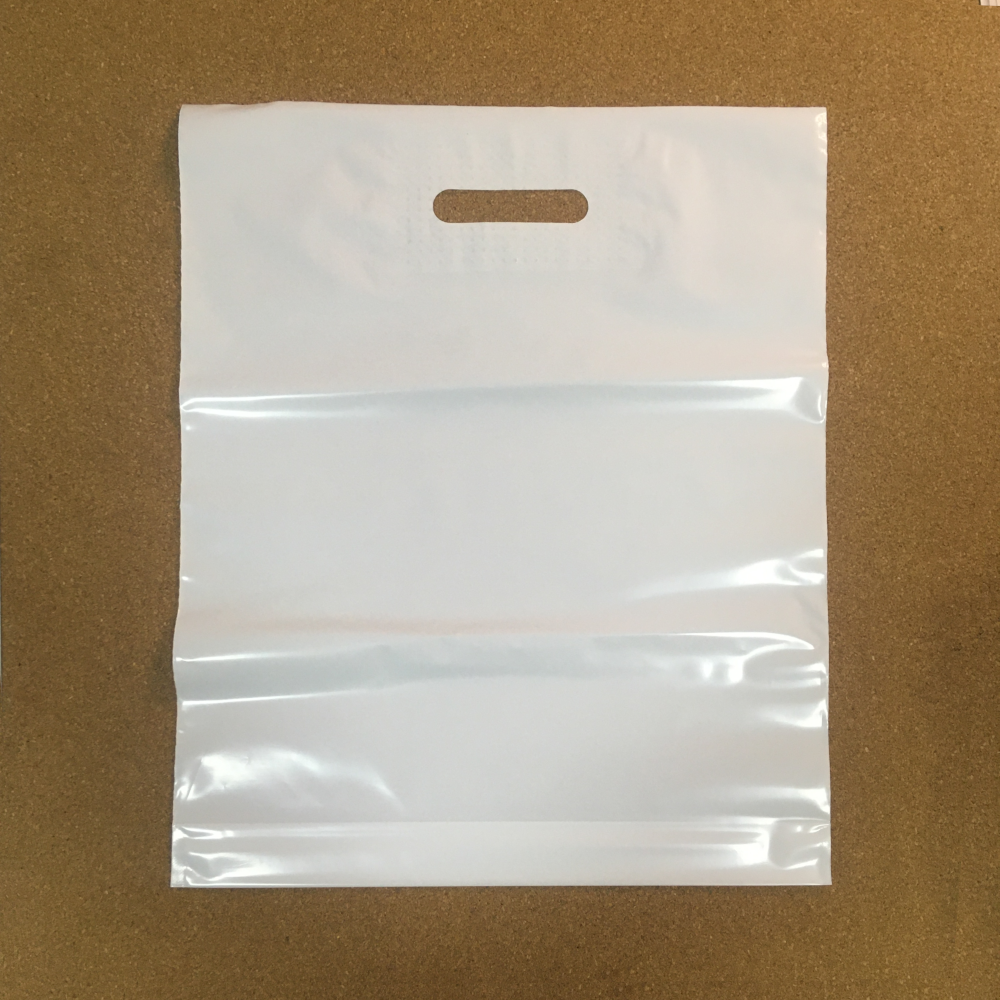 Размер 360×450(+30) мм. Плотность 70 мкм. Цвет пленки белый. Усиленная вырубная ручка. Закладное дно.