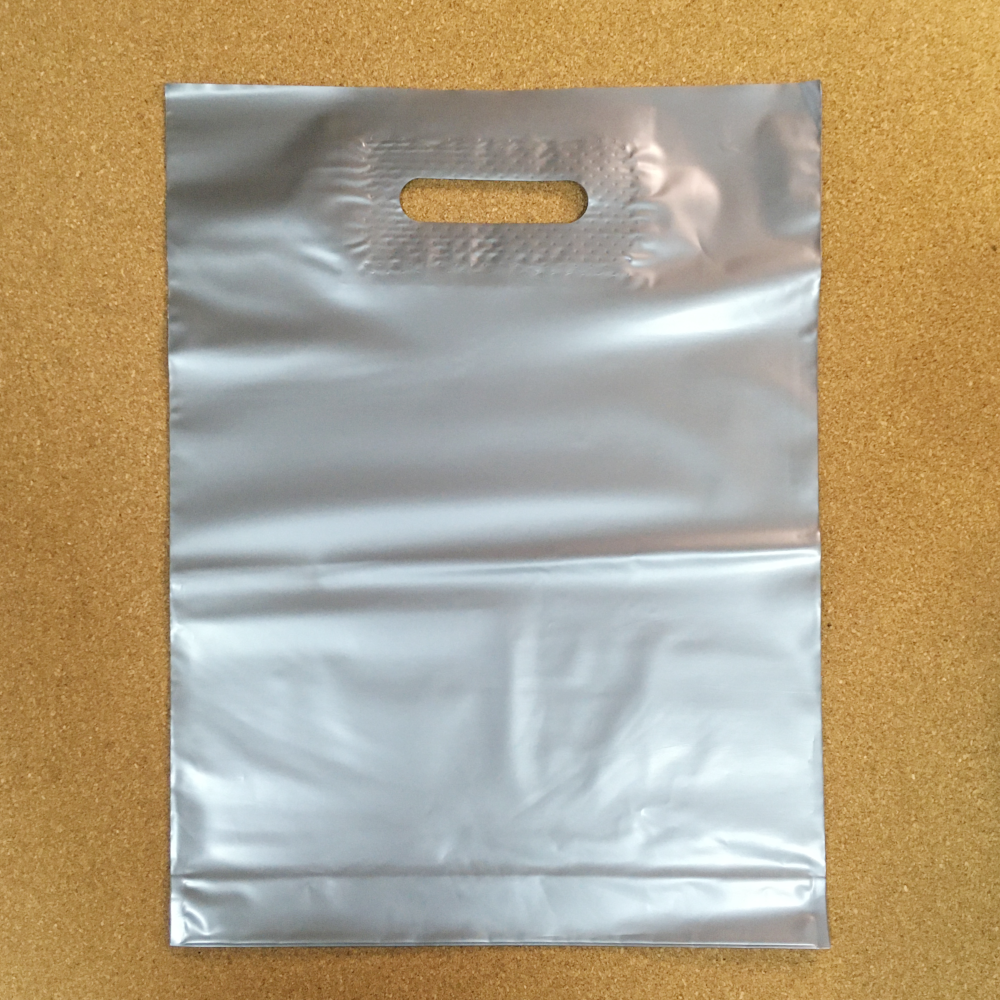 Размер 300×400(+30) мм. Плотность 70 мкм. Цвет пленки серебряный (серый металлик). Усиленная вырубная ручка. Закладное дно.