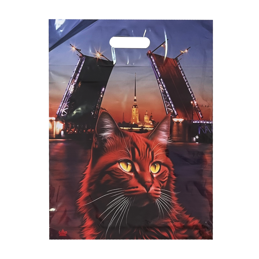 На пакете фотографический коллаж из вида на разводной мост и котика.