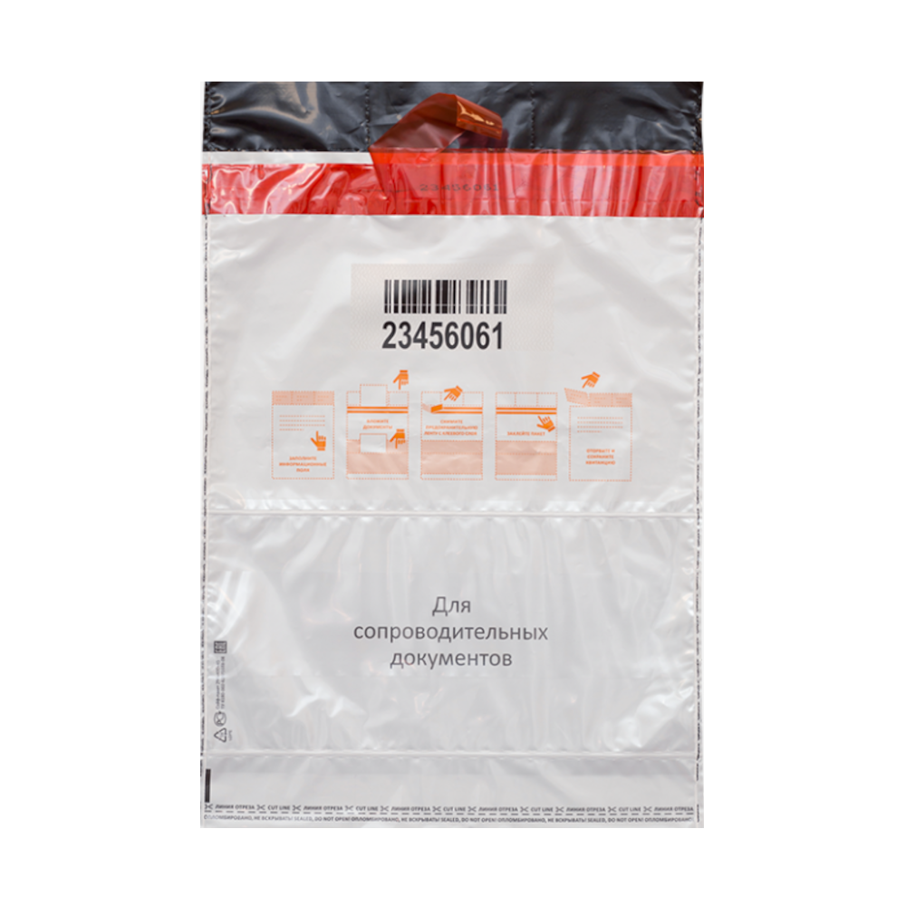 Размер 328×510+50 мм. Материал многослойная полимерная пленка 70 мкм. Три отрывные квитанции.